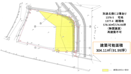 | 備考 | 公簿面積540.96㎡(約163.64坪)の内、建築可能面積は304.11㎡(約91.99坪)となります※「宅地」以外に地目「山林」及び「雑種地」の部分がございます■公拡法第4条届出要■都市計画法第53条許可申請要■埋蔵文化財包蔵地内■接道:南側県道約6.3~7.5m,西側公道約4.5m■現況有姿引渡し■別途北側に2筆有り(面積:578.30㎡)※無償譲致しますが、建物再建築が出来ない敷地です■建築条件はございません | ||||